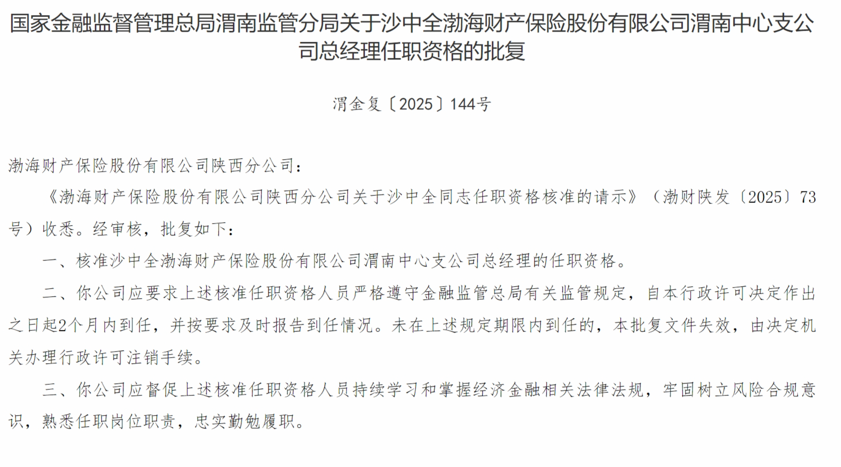 10月24日,国家金融监督管理总局渭南监管分局发布关于沙中全渤海财产保险股份有限公司渭南中心支公司总经理任职资格的批复股升网,核准沙中全渤海财产保险股份有限公司渭南中心支公司总经理的任职资格。
